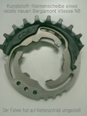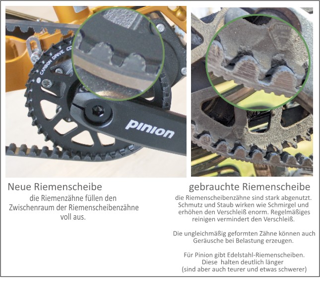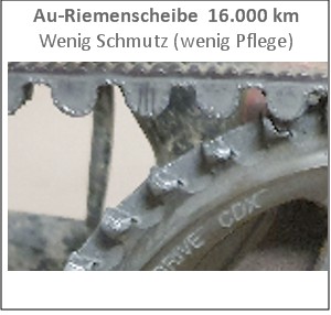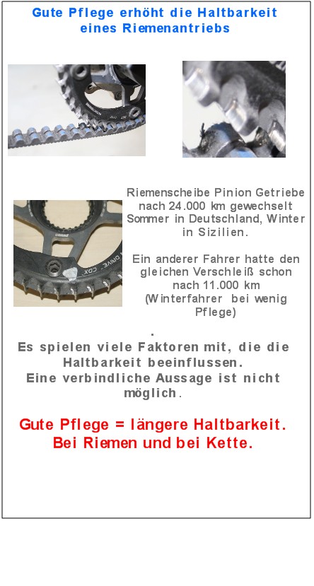 Haltbarkeitsbeispiele von mehr oder weniger gut gepflegten Riemenantrieben. Riemem erfordert weniger Pflege als Kette - Schmutz und Streusalz erhöht auch Riemenantrieb den Verschleiß