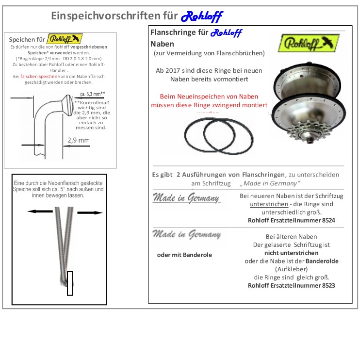 • bei Neueinspeichung schreibt Rohloff (seit 2017) die Verwendung von Naben-Flanschringen   vor. Diese Ringe verhindern das Ausreißen der Nabenflansch bei starker Belastung (Vielfahrer, Tandem, schwere Fahrer, .....)  Die Speichenanordnung muss gleich bleiben, damit keine weitere Einkerbung durch die Speiche entsteht.