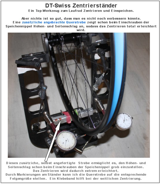 Eine Querstrebe hilft, den Höhen- und Seitenschlag schon beim Eindrehen der Speichennippel grob einzustellen. (siehe Beispiel an meinem Zentrierständer)