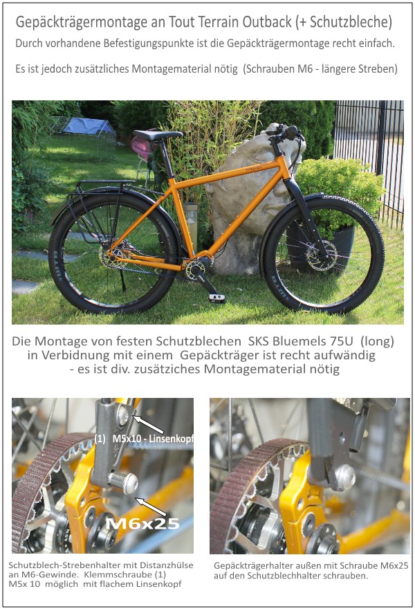 =>Montage-Tipps für Schutzbleche an Tout Terrain Outback Das Tout Terrain Outback ist ein Mountainbike. Es sind Haltepunkte für Gepäckträger vorhanden. Möglich ist auch die Montage von festen Schutzblechen - bei MTBs aber ungewöhnlich und relativ aufwändig - besonders in Kombination mit einem Gepäckträger. .