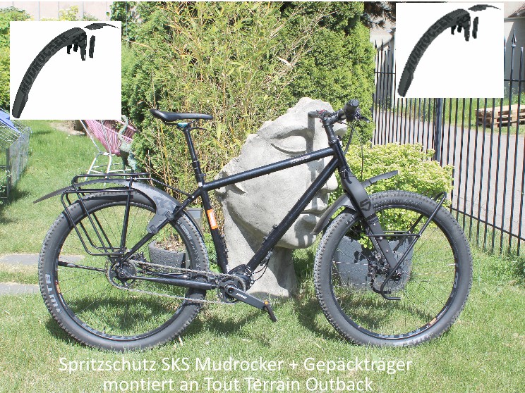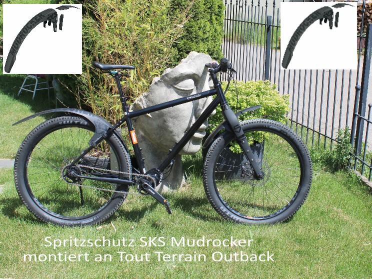 Die Montage von festen Schutzblechen am Tout Terrain Outback ist recht aufwändig.Eine gute Alternative sind der Spritzschutz SKS Mudrocker front und SKS Mudrocker rear. (siehe Beispielabbildungen an einem Kundenrad) Der Spritzschutz wird mit Bändern am Rad befestigt. Dies ist nur ein Tipp - den Spritzschutz habe ich nicht im Sortiment. (wer googelt, wird finden...)
